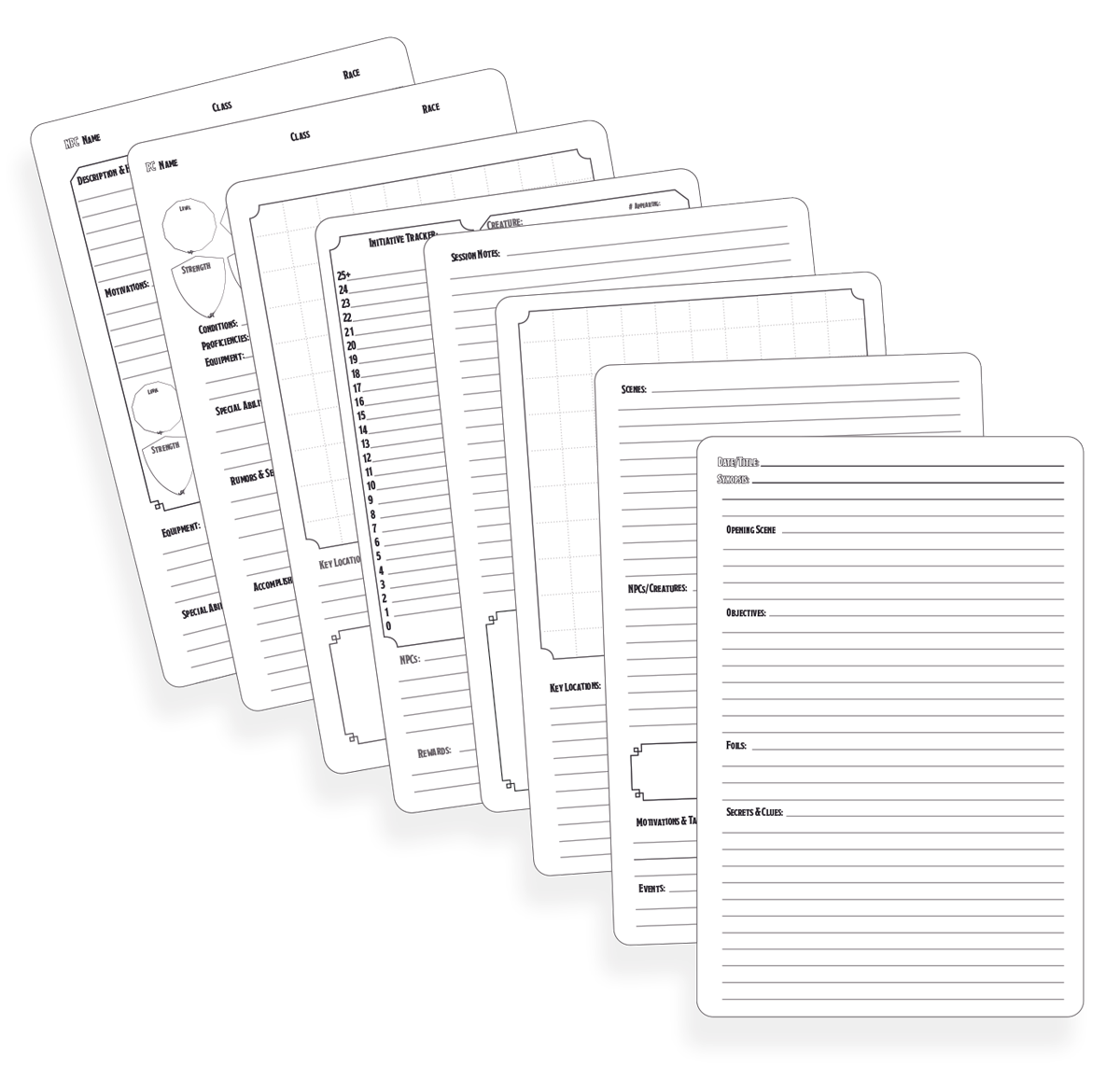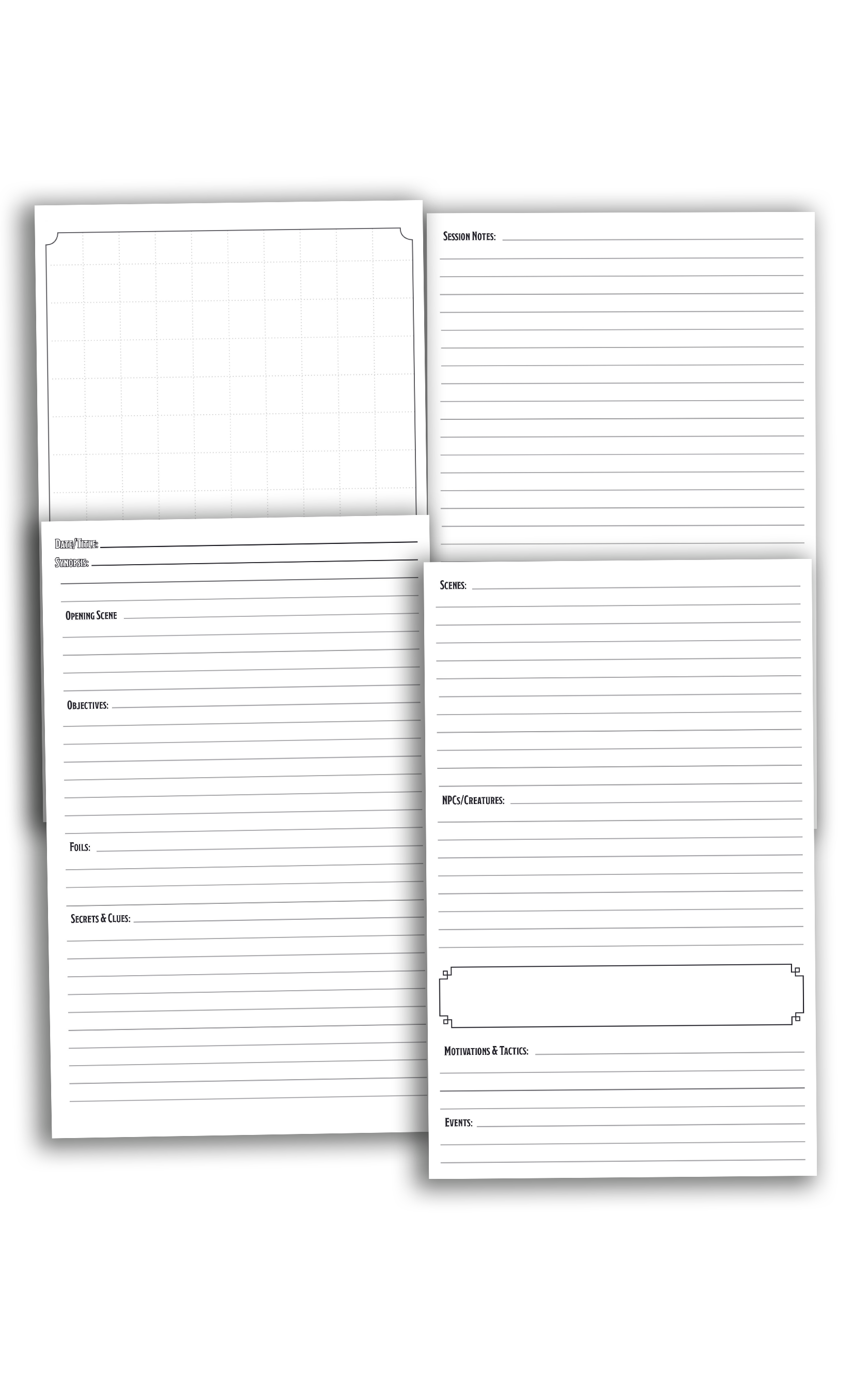 30 x 4-page Session Planners: Track session goals, scenes, NPCs, and surprises with space to expand on the fly.